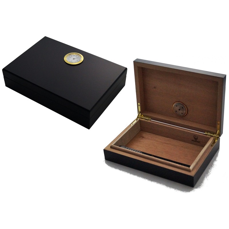 Small humidor with hygromteter and GERMANUS crystal humidifier, lined with Spanish cedar wood. High quality, clean workmanship. Matt black, therefore unsusceptible in case of transport of the humidor. This cigar humidor is a very practical portable model.