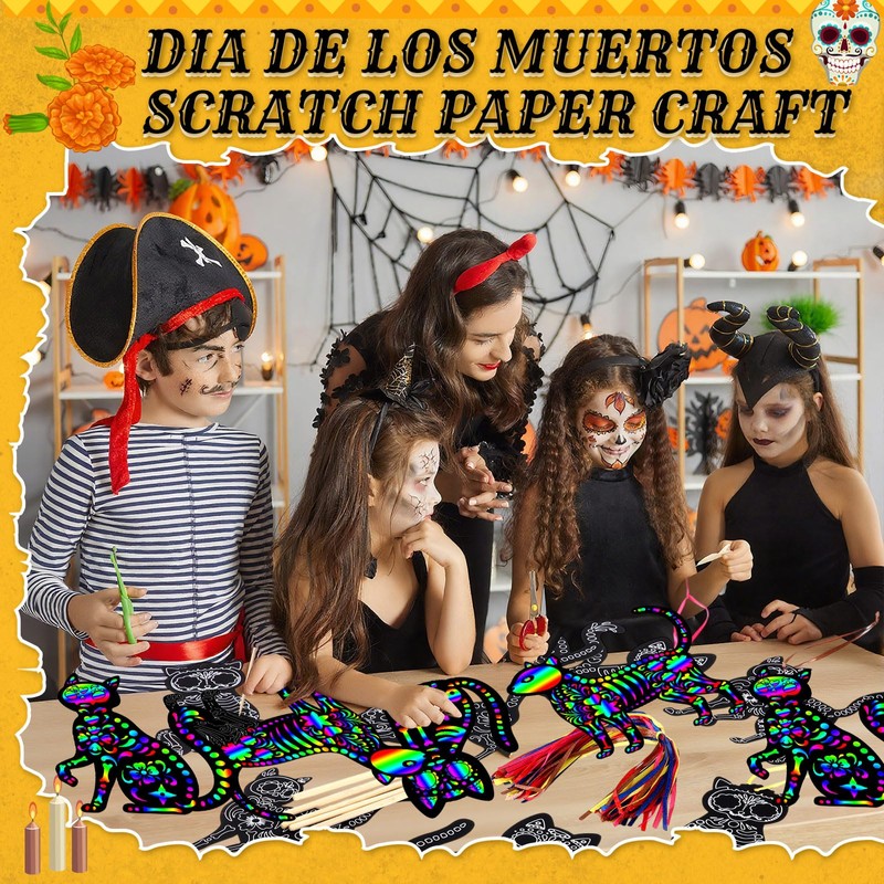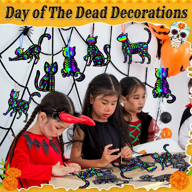 - Day of the Dead Scratch Card Set: this set includes 60 Día de los Muertos scratch cards, 60 colorful ribbons and 30 scratch sticks; The sufficient quantity and rich designs bring you an interesting Day of the Dead DIY feast; 6 different styles of skeleton cat patterns are enough for you, your family and friends to give full play to your creativity and create your own Day of the Dead theme art