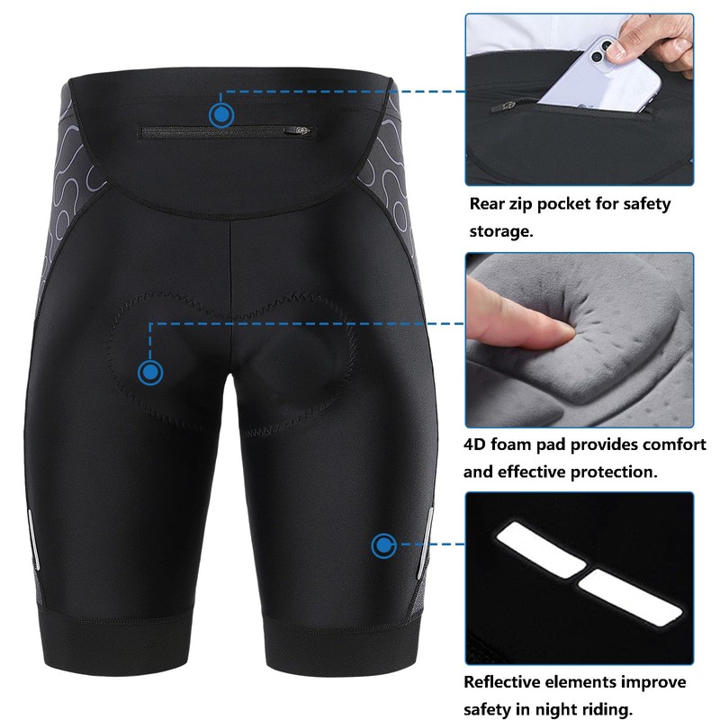 - PRACTICE DESIGN : These cycling shorts for men feature 2 side pockets holding up 6.5" mobile phone for great convenience. The breathable wide waistband offers a snug fit. Reflective elements improve safety in night riding or low-sight condition. The flatlock seam reduces friction and eliminates irritation.
