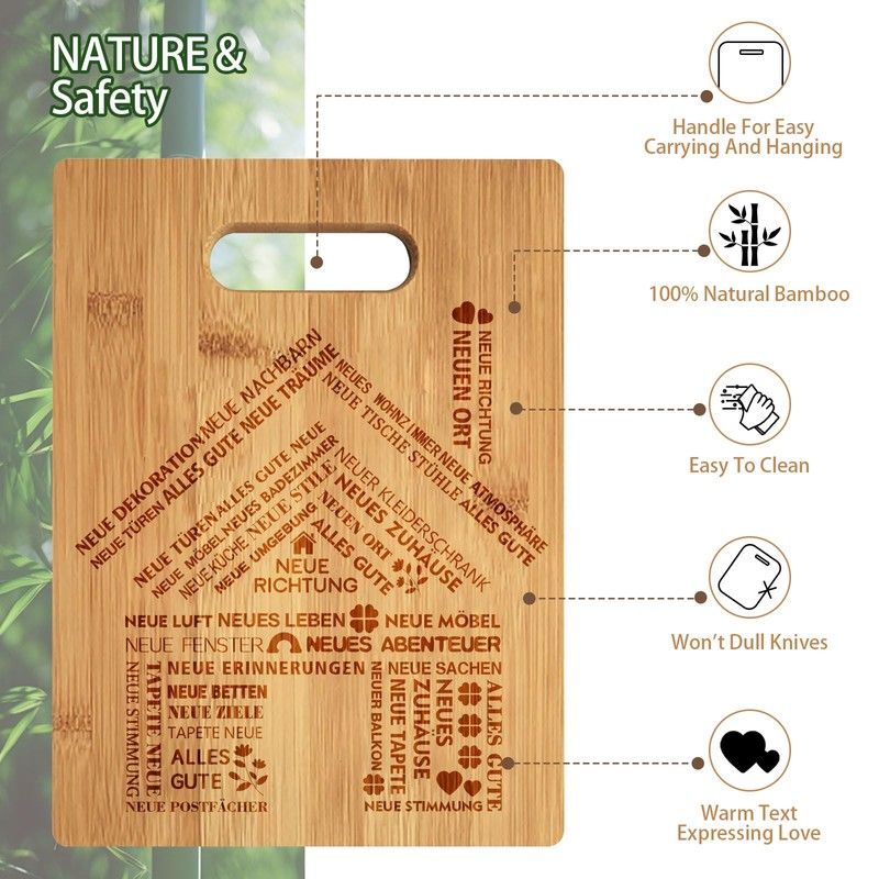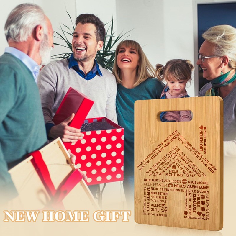 - Geschenke zum Einzug: Sind Sie auf der Suche nach einem besonderen Einweihungsgeschenk? Dieses praktische und schöne Bambus-Schneidebrett ist das perfekte Geschenk für Sie. Das Schneidebrett ist mit vielen Worten der Glückwünsche zu Ihrem neuen Haus und einem schönen Hausmuster eingraviert, zart, schön und praktisch, ist das am besten geeignete Geschenk für Freunde oder Familie am Tag der Einweihungsfeier