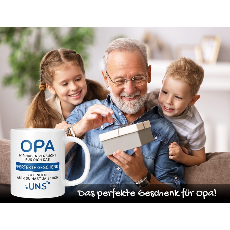 - OPA GESCHENK TASSE - Es ist nicht so einfach, das passende Geschenk für Deinen Opa zu finden. Diese liebevolle Tasse mit dem Spruch "Opa - Wir haben versucht für Dich das perfekte Geschenk zu finden. Aber Du hast ja schon UNS" bringt jeden Opa zum Schmunzeln. Ideal als Geschenkidee für Deinen Opa zum Geburtstag, Vatertag oder Weihnachten.