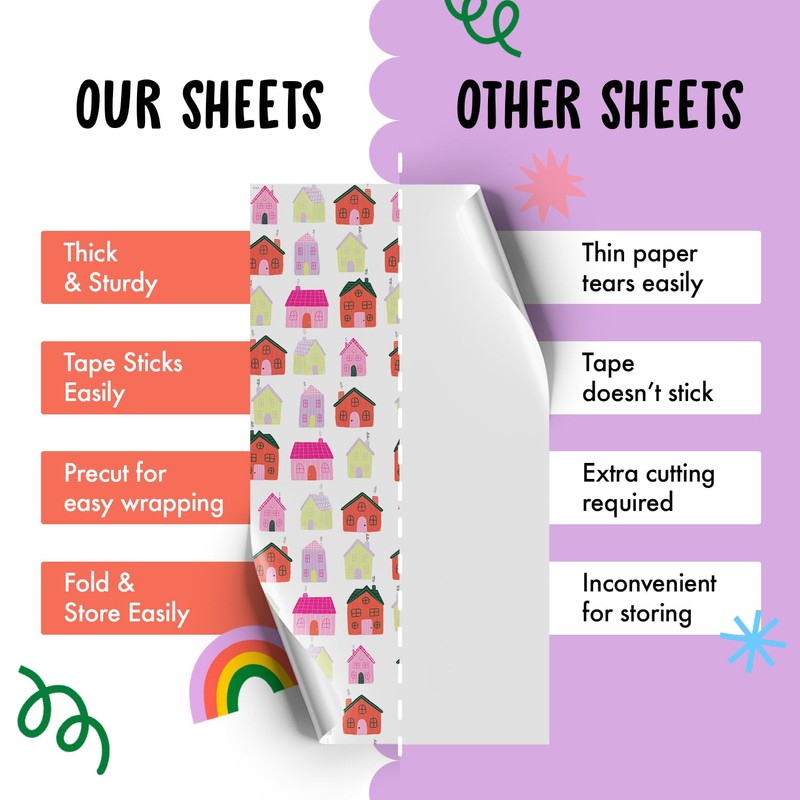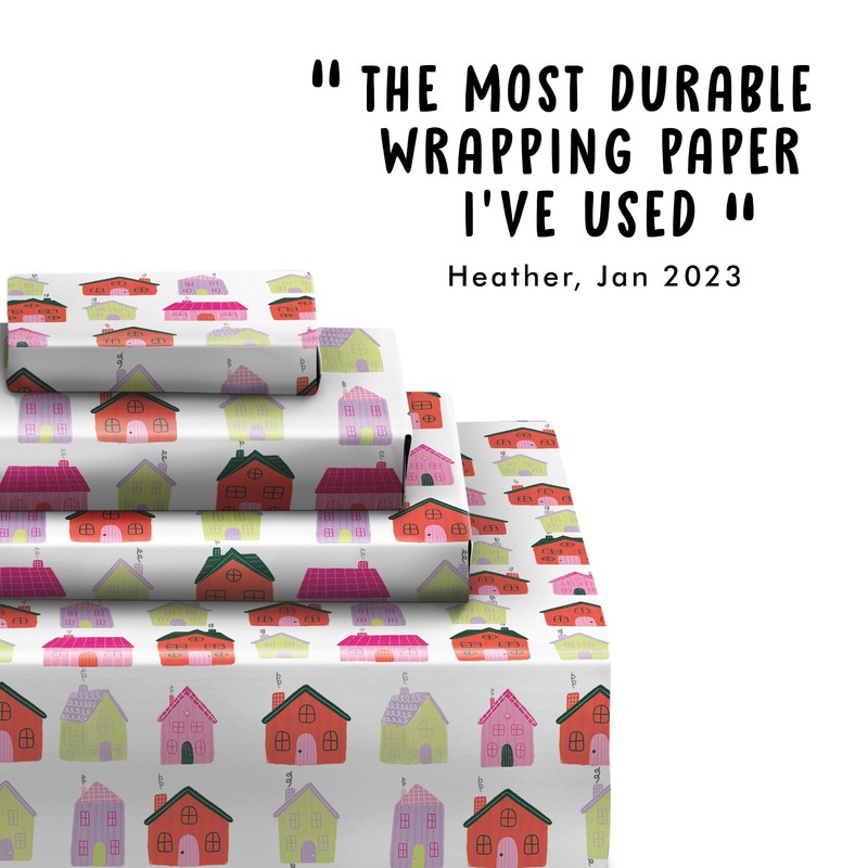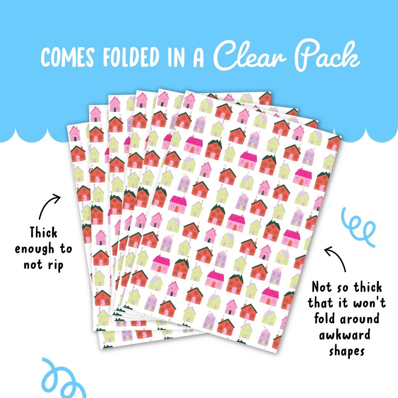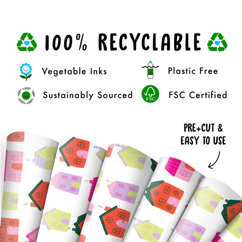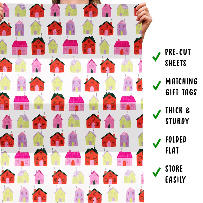 Geschenkpapier Frauen – 6 Blatt weißes Geschenkpapier mit Anhängern – süßes handgezeichnetes buntes Haus – für neues Zuhause, Geburtstag – recycelbar – von Central 23