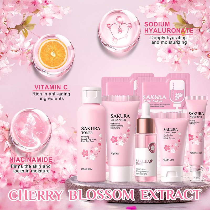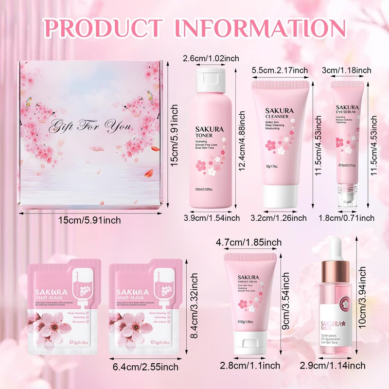- Das exklusive Set der Sakura Essence Skin Care Series umfasst Sakura Cleanser, Sakura Toner, Sakura Essence, Sakura Cream, Mask Mud und Sakura Eye Essence. Dieses Beauty-Set eignet sich sehr gut als Geschenk für Töchter, Freundinnen, Ehefrauen und Freunde.kompaktes und tragbares Design eignet sich für die tägliche Hautpflege und auf Reisen und ermöglicht so eine einfache Anwendung.