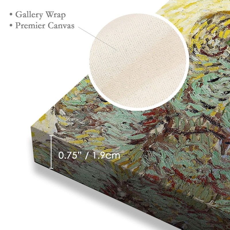 - Gallery wrapped canvas: Our gallery wraps are printed on thick, high-quality canvas and coated with a glossy varnish to protect, preserve, and enhance fine art. It is then mounted onto a .75" pine wood frame and arrives ready to hang.
