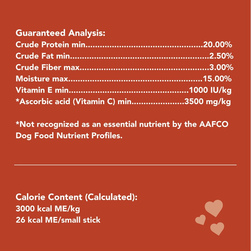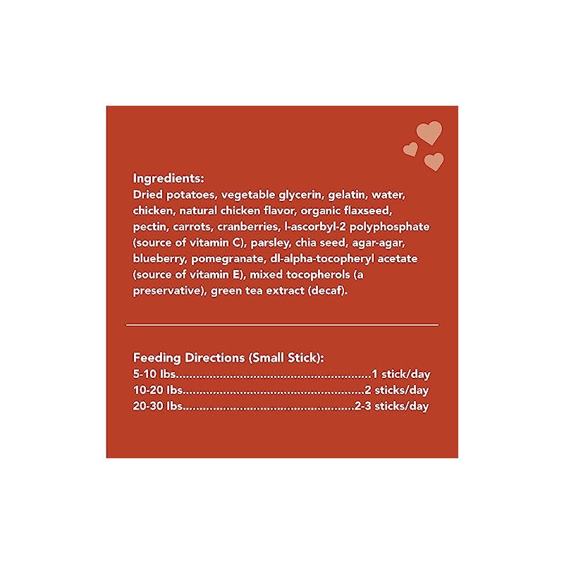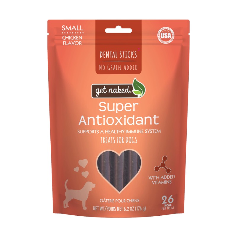 Get Naked Super Antioxidant dental chew sticks are grain free treats packed with a special blend of antioxidant rich super fruits and veggies. Antioxidants are crucial for neutralizing the cell-damaging free radicals that your dog is exposed to on a daily basis. Our Super Antioxidant chew sticks are fortified with vitamins and minerals to further promote good health and overall wellness for your special four-legged family member. Your dog deserves the very best and our tasty chicken flavored chew sticks are sure to satisfy their cravings while delivering an abundance of healthy ingredients.