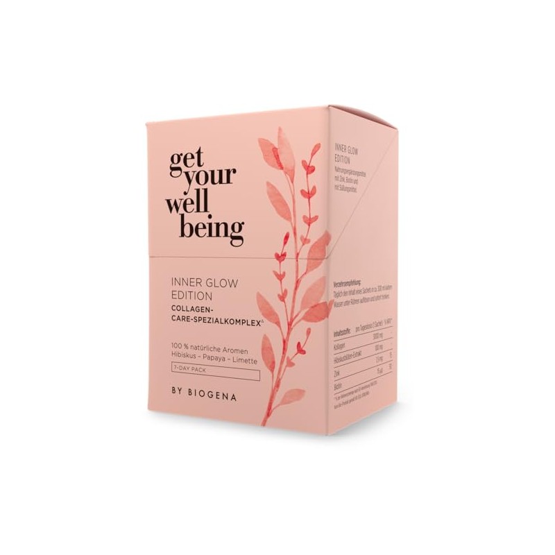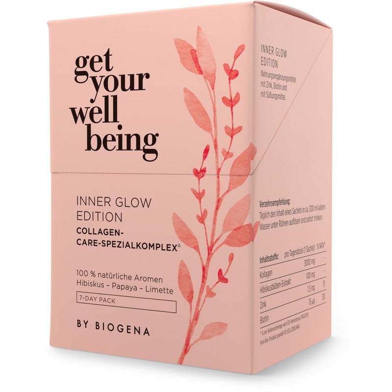 get your wellbeing by BIOGENA - Inner Glow Collagen Complex with NATICOL® Fish Collagen - With Biotin & Zinc for Skin Tightening & Cell Protection - 7 Drinkable Sachets with Hibiscus Papaya Lime