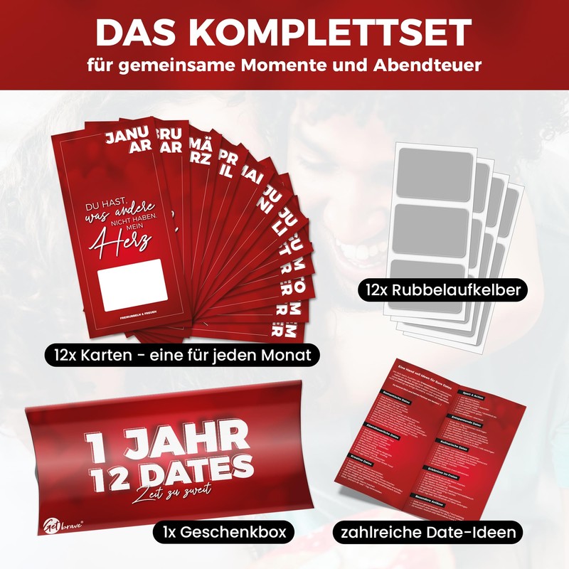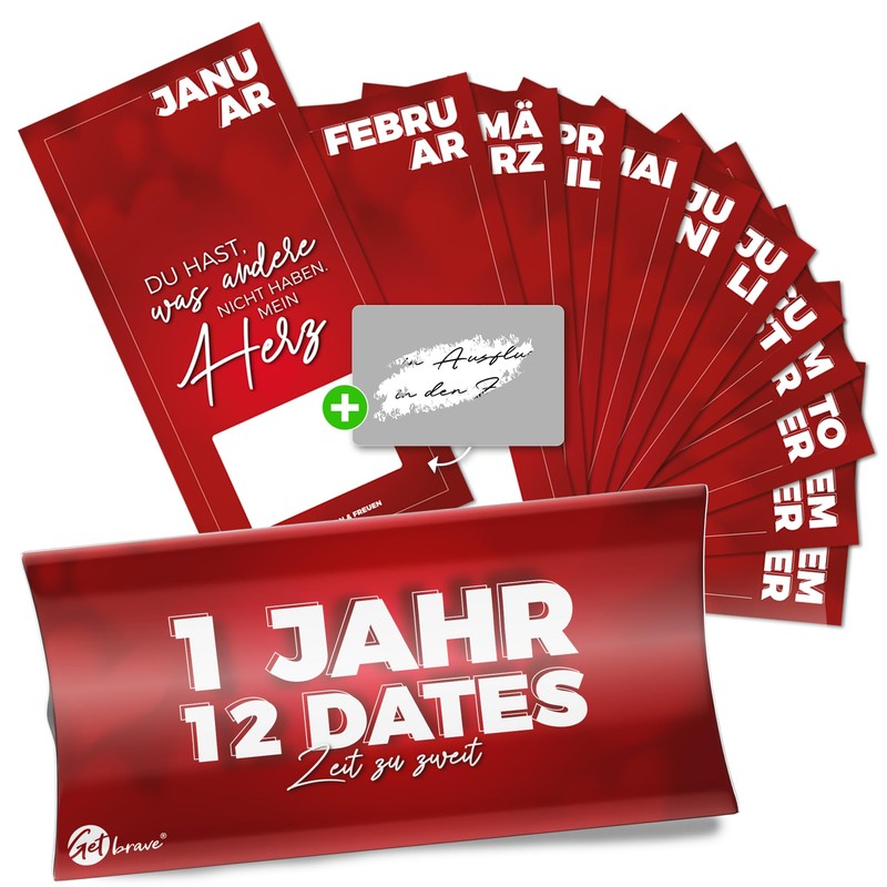 getbrave 1 Jahr, 12 Dates - Das Geschenk für gemeinsame Zeit - Dates zum selber ausfüllen mit Rubbelaufkleber - Überraschung zum Geburtstag & Jahrestag für Mann, Frau, Partner, Freundin & Freund