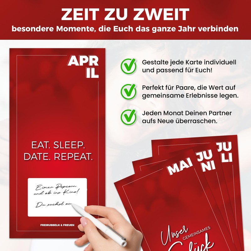 - ❤️ Perfekte Geschenkidee: Ideal für Paare, die ihre Beziehung mit regelmäßigen, besonderen Erlebnissen bereichern möchten. Ein einzigartiges, persönliches und unvergessliches Geschenk zum Valentinstag, Jahrestag, Geburtstag oder einfach zwischendurch!