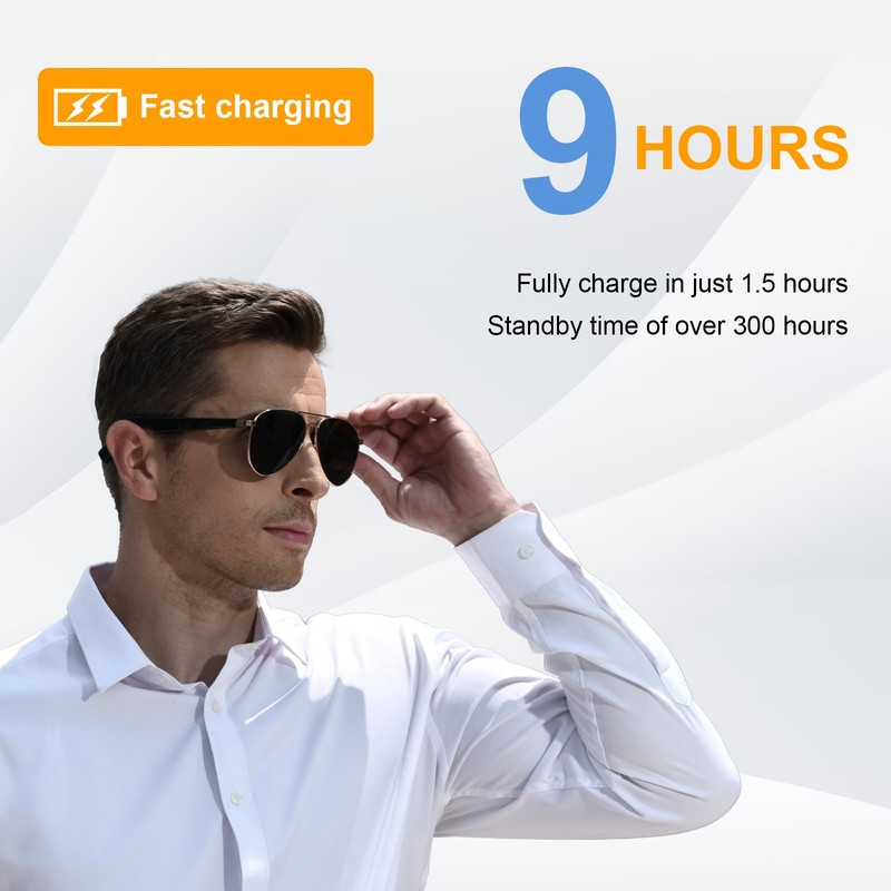- 【ALL Day Battery】:Our bluetooth glasses have a long-lasting battery life of up to 9 hours of media playback and a standby time of over 300 hours.Equipped with fast-charging technology,they fully charge in just 1.5 hours. Additionally, you'll receive voice notifications when the battery is running low.