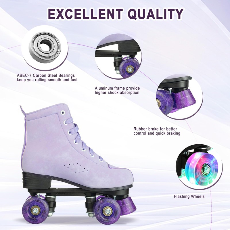 - Wear-Resistant Four Wheels: This beginner roller skates are equipped with sturdy ABEC 5 bearings four-wheels, which is made of durable and molded materials, this four wheels can provide safer and more reliable skating performance. The flash wheels make you more cool in the skating, and have a fun skating time.