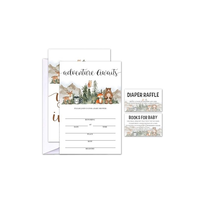 Geuro Set of 25 Baby Shower Invitations with Envelopes, Diaper Raffle Tickets and Baby Shower Book Request Cards, Adventurer Jungle Animals