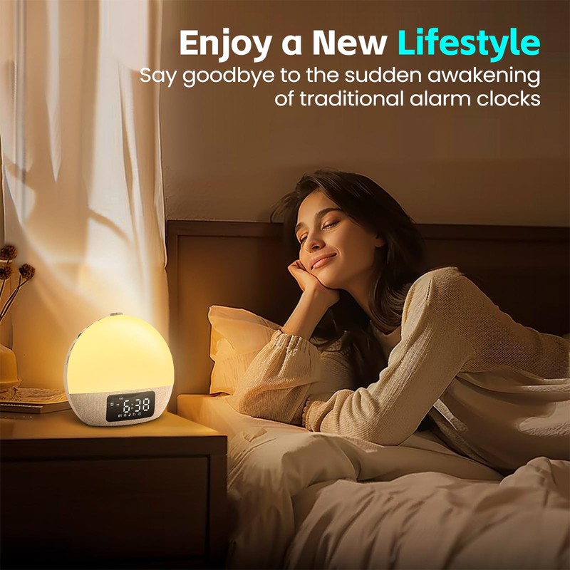 - Healthier Wake-Up CallBefore the alarm time, the sunrise process is simulated (10-60 min can be set), the sunrise light will gradually brighten from 10% to 100%, say goodbye to the traditional alarm clock of waking up suddenly, and wake up in a cozy environment