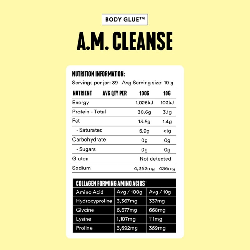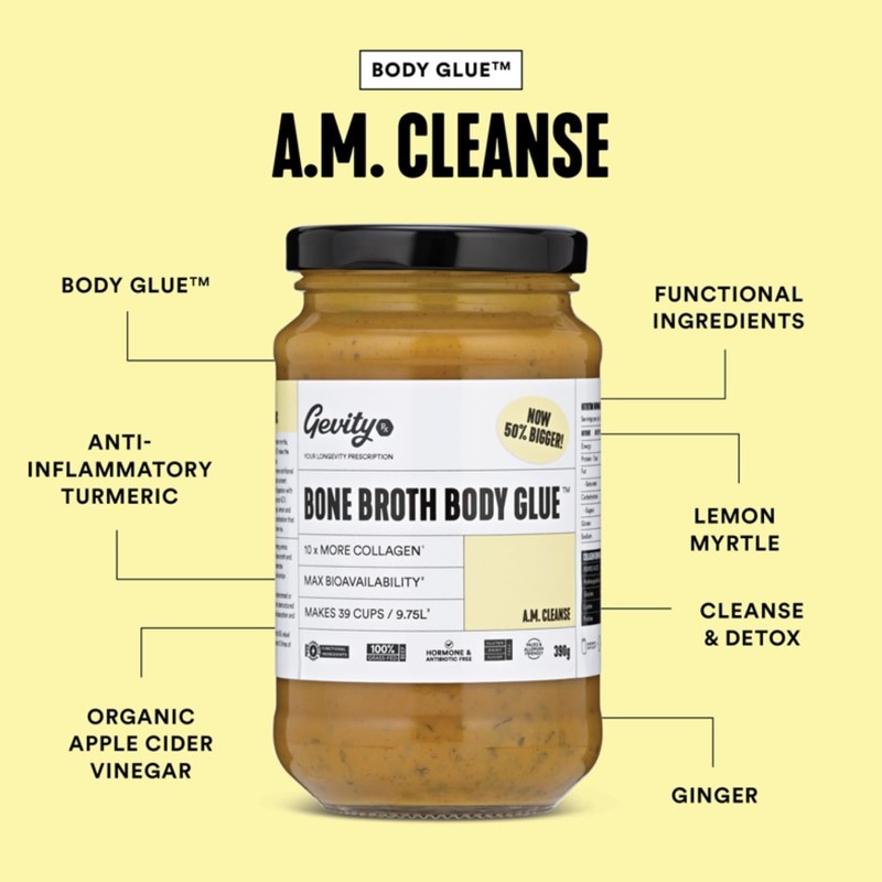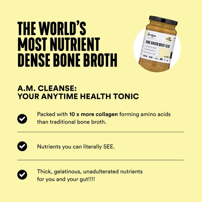 - Pure Nutritional Excellence: A.M. Cleanse Body Glue is crafted from simple yet potent ingredients, including grass-fed beef bones, naturally evaporated sea salt, lemon myrtle, ginger, turmeric, and organic apple cider vinegar (ACV). This combination forms a nutritional powerhouse that nourishes your body from within, promoting overall wellness and vitality.
