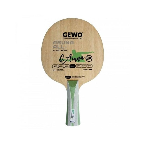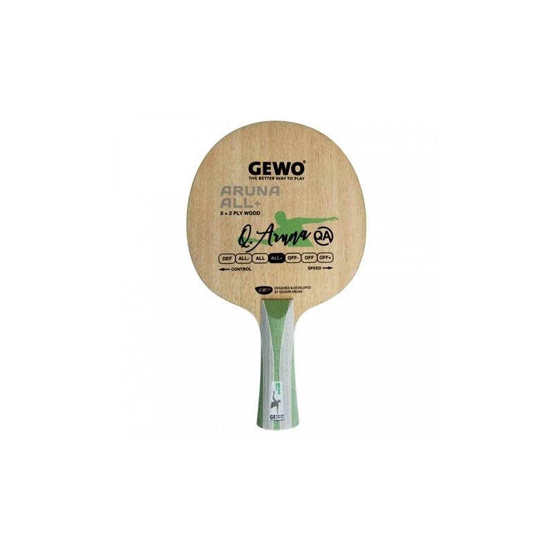 GEWO Aruna All Plus Table Tennis BladeThe Gewo Aruna Allround Plus Carbon Blade is designed for a versatile all-around player who seeks control and extended dwell time on the racket. This blade uses thin plies and is stabilized by two carbon plies. The carbon plies expand the sweet spot of the racket giving it consistency throughout. The Aruna All Plus is a perfect blade for the developing player or the defensive specialist seeking to maximize spin and deception.The African legend trusts Gewo! Where Quadri Aruna hits, there are great rallies and spectacular rallies inevitable. The multiple African Cup winner knows how to inspire the audience with his athletic game.Manufacturer Specifications: Approximate weight: 90gSpeed: 86Control: 97Playing style: All+Layers: 3+2