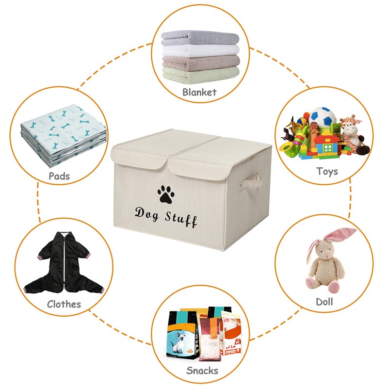 Geyecete Large Storage Boxes - Large Linen Fabric Foldable Storage Cubes Bin Box Containers with Lid and Handles for Dog Apparel & Accessories, Dog Toys(BambooiBeige)