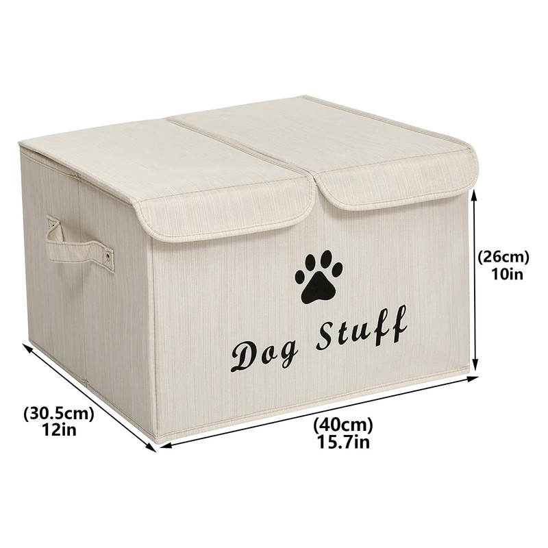 - 4. DOUBLE-SIDED - Front side is Printed with "Dog Stuff", back side has no writing. the storage basket stands upright and the convenient handles make it easy to transport or move when needed.