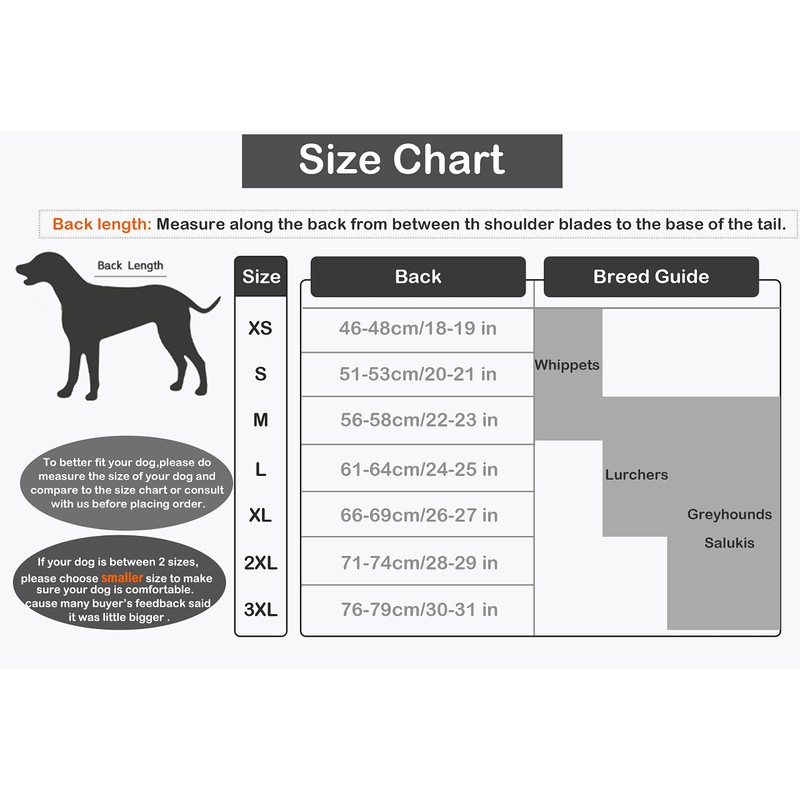 - 5. Please measure your dog's exact chest girth, back length and leave 1-2 inch more.PLEASE NOTE:Please make sure to measure your dog's size before purchasing and read the size chart carefully.