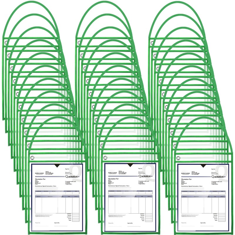 Geyee 50 Pack Job Ticket Holders Work Order Pockets for 9 x 12 Inch Hanging Sleeve Plastic Shop Ticket Holders with Strap, Both Sides Clear(Green)