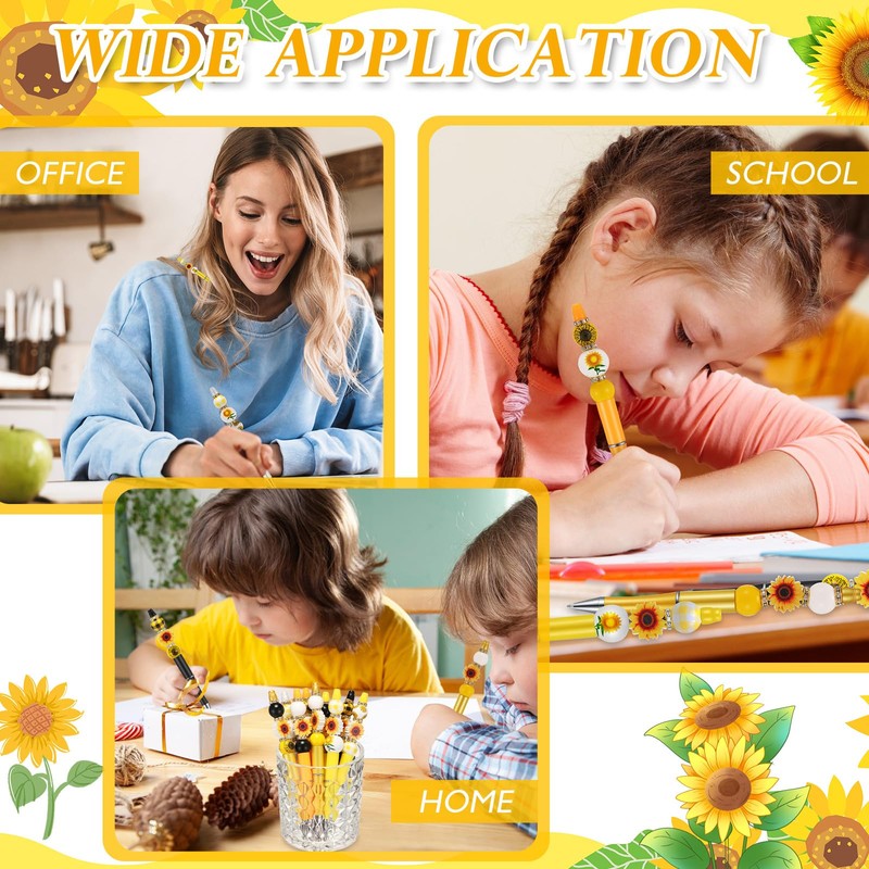 Geyee Geyee 12 Set Plastic Beadable Pens Assorted Bead Pens Crystal Wood Round Spacer Set Black Ink DIY Ballpoint for Women men Gift School Office Supplies(Sunflower)