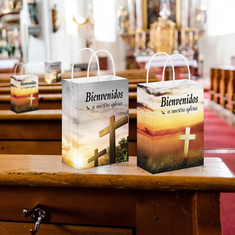 - Packing Information: the package contains 50 Spanish church gift bags, with 2 different designs, 25 bags each, printed " Bienvenidos a nuestra iglesia" , enough to meet your daily use and replacement needs; The bags provide memorable souvenirs for your guests, making your event unforgettable