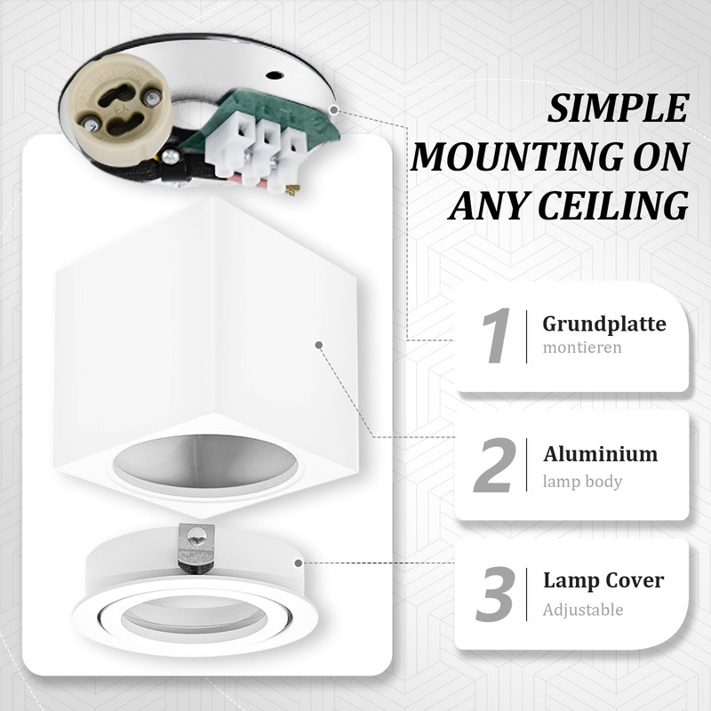 - LieferumfangIm Lieferumfang sind 1 x Aufbauspot Eckig Wei?, 1 x GU10-Fassungen sowie fr die Montage erforderliche Dehnrohre, Schrauben und Montageanleitungen enthalten. Wir verfgen ber ein professionelles Kundenserviceteam. Sollten Sie auf Probleme sto?en, werden wir schnell reagieren und innerhalb von 12 Stunden L?sungen bereitstellen, sodass Sie sich keine Sorgen machen mssen
