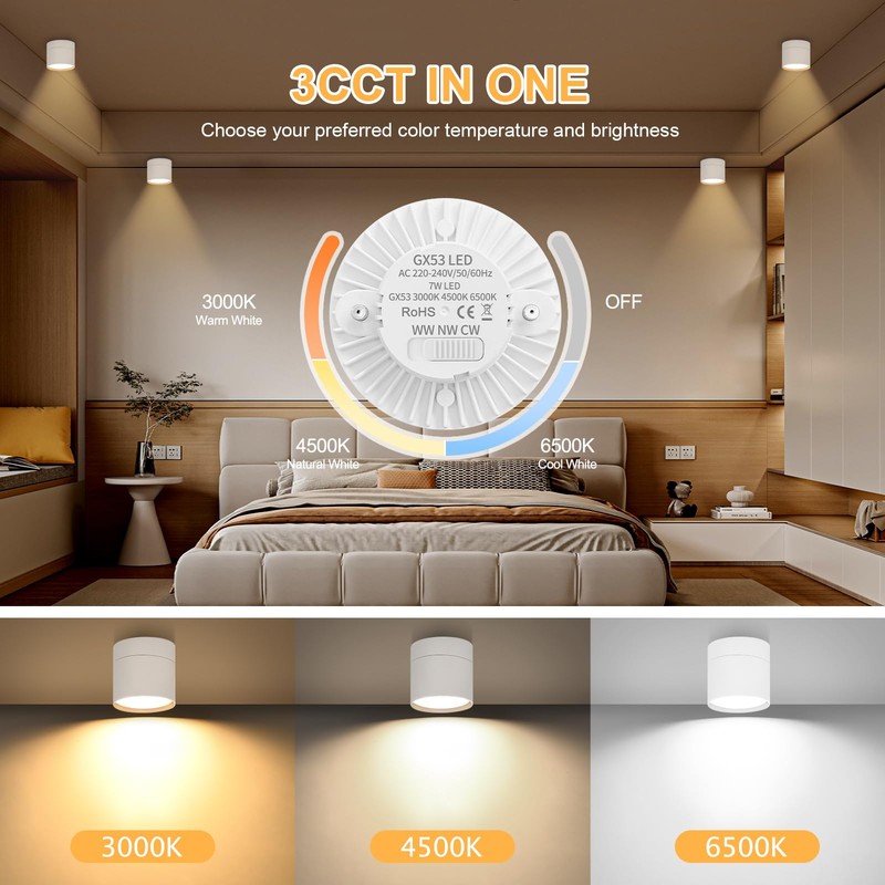 - Bright and healthy light: the surface-mounted spots contain a 3CCT GX53 LED module. The light intensity of 7 W 800 lm ensures a bright lighting experience. Use high-quality COB lamp beads, no flicker, no noise, anti-glare, eye-friendly and a running time of up to 30,000 hours. The colour rendering index CRI>90 restores the true colour, which means that the colour appears more intense than the CRI 80 lamp
