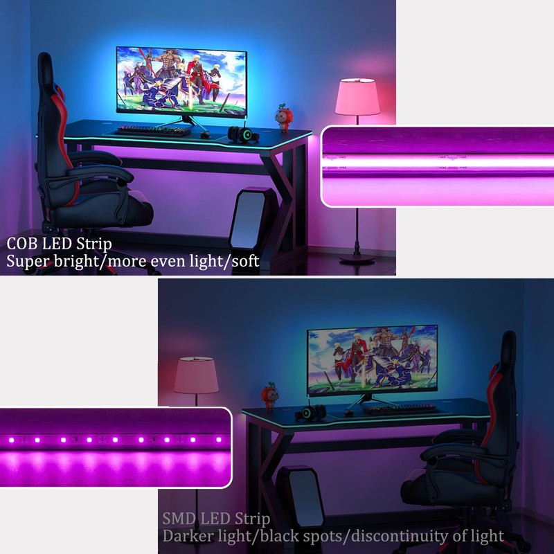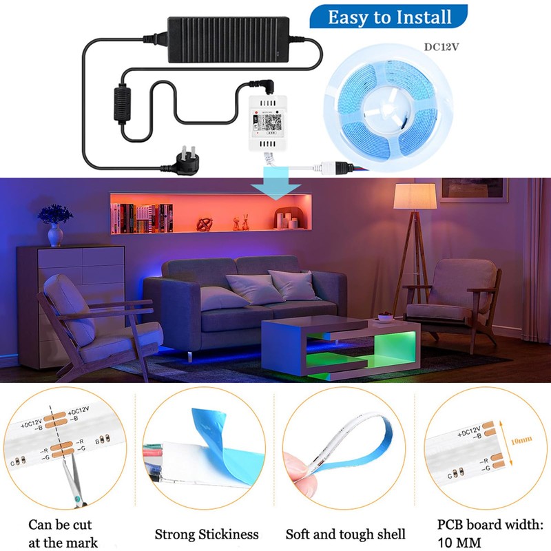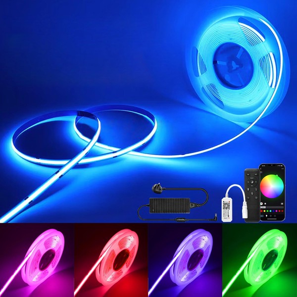 - High Density Flexible COB LED Strip Set5M RGB COB LED Strip with Power Supply and Controller. 2880 LEDs (576 LED/M) with high color rendering index,COB provides brighter and more uniform light than SMD strips.COB design,the light is soft and even,so you dont have to worry about bright spots at ordinary times,which gives your eyes a more comfortable feeling (Note:bright spots will appear when the brightness is very low)