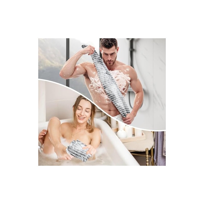 Features:- The back exfoliating scrubber featuring premium nylon, polyester fabric and in a stronger weave.It is the perfect shower accessory for family members.- Soak the bath towel in warm water for 2 minutes before using exfoliating and washing the loofah, and apply proper amount of bath gel to enrich foam when bathing.- Exfoliating back scrubber great for cleaning all parts of the body,including the back and feet. The body back washing towel is reusable and durable.- This exfoliating towel is porous and can dry quickly, providing a cleaner and more enjoyable bathing experience.The washer has been expanded and extended to make it longer than a regular towel.- After shower, just hang them anywhere and the wash cloth towel will dry quickly, preventing undesirable smelly mildew.Instructions for usage1. Wet the exfoliating towel with warm water for about 2 minutes first. Then put the soap in the center of the cloth and massage. Then it will produce rich foam .2.When using a shower towel to clean your back, you only need to hold one end of the towel with both hands, wrap it around your body, and use it to scrub your back.3. You can also wrap it diagonally around one shoulder and move it up and down on your back in a forward backward motion.4. 4. When washing the whole body, fold the exfoliating towel into a square shape or knead it into a ball shape, and gently wipe the whole body.5.When washing feet, you can apply more pressure to help remove dry dead skin. (Do not use exfoliating towels to wipe your face.)Specifications:Material: Nylon And Polyester FibersColorBlackQuantity: 2 PcsSize:100*25 cm/39.4*10 inchesLongest Stretchable Length:110 cm/43.3 inchesPackage Included:2Pcs x Back Exfoliating TowelNote:1.It is not recommended to use shower exfoliating back scrub for infants, sensitive skin, delicate skin, or areas with wounds.2.After using a towel, rinse it with water and hang it up. They dry quickly.3.When you notice the texture starting to change, it's time to replace it.