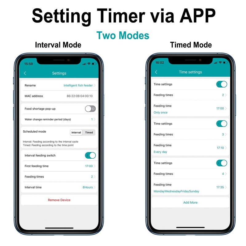 • 【App-WiFi Automatic Fish Feeder】 Only supports connecting to 2.4GHz WiFi. App can set two timing modes. Timing mode: feeding according to the specific time set. Interval mode: set the first feeding time, and then set an interval time period, the fish feeder will feed according to the interval time.