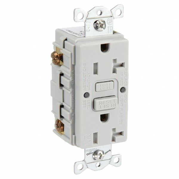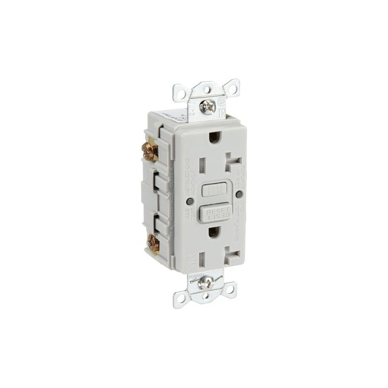 'GFCI Receptacle, Commercial Environments Application Environment, Self-Testing Yes, NEMA Configuration 5-20R, Number of Poles 2, Number of Wires 3, Tamper Resistant Yes, Weather Resistant Yes, 20A Amps, Voltage 125VAC, Reset Type Automatic, 1.0 HP, Outlet Type Decorator, Gray, Power Indicator No, Standards UL Listed, CSA Certified, Surge Suppression No, Mounting Type Flush, Wiring Method Back and Side'