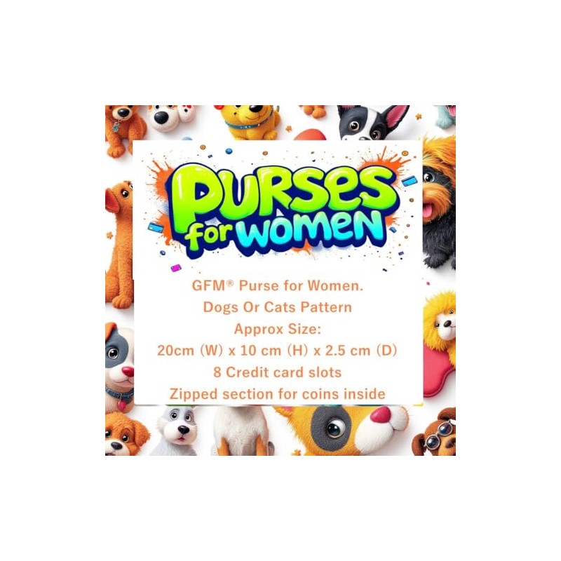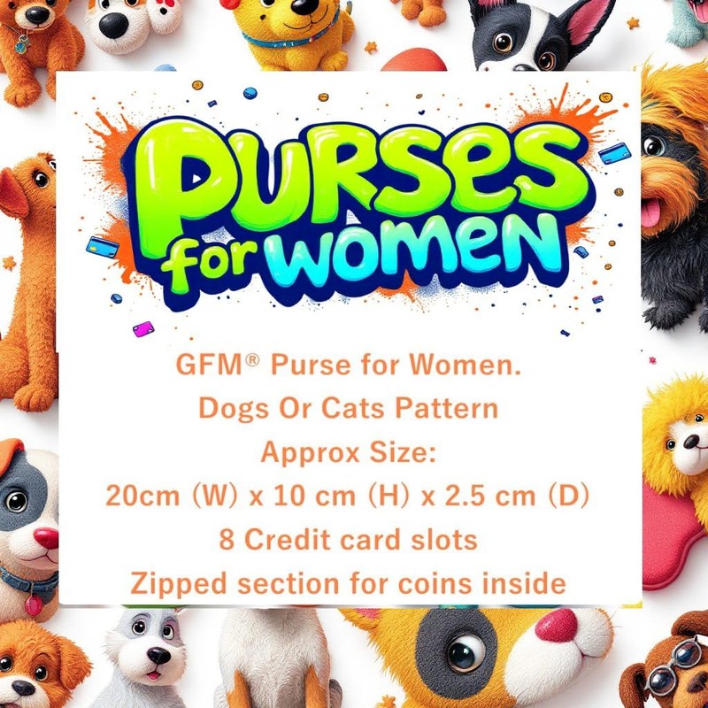 - GFM Dog pattern wallet for women. Approximate Dimensions: 20cm (W) x 10cm (H) x 2.5cm (D) 8 credit card slots, zipped pocket for coins inside.