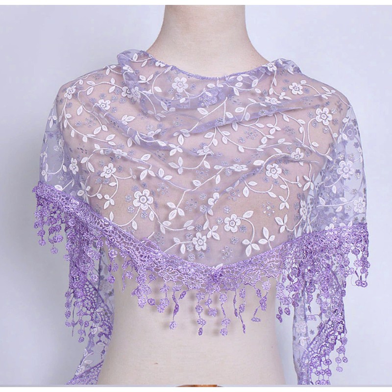 - Style Tri-85: This style code very thin, transparent and very Light weight gauze like fabric. Floral Embossed print design with slight sparkle glitter. Lace with tassels trim. Material: Polyester. Weight: 60gms only. Suitable in summer when a very light and thin scarf is needed. The scarf size is very small (petite).