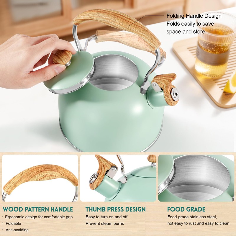 GGC GGC Tea Kettle for Stove Top, 85OZ/2.6QT Whistling Tea Kettles for Boiling Water Milik or Coffee, Green Stainless Steel Tea Pots with Wood Pattern Folding Handle, Thumb Design Control Kettle Outlet