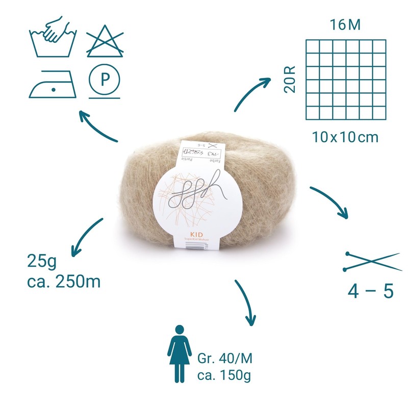 - 65% Super Kid Mohair / 5% Virgin Wool / 30% Polyamide - Length: 250 m per 25 g ball of wool, needle size 4-5, consumption approx. 150 g for a jumper in size 40 - Made in Italy - Hand wash
