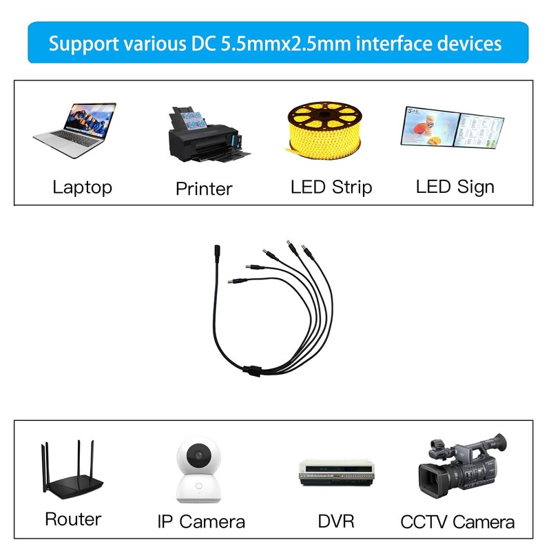 - 3.Cable type: Female DC 5.5 × 2.5 mm to male DC 5.5 × 2.5 mm, with options for 1 female to 2 male, 3 male, 4 male, 5 male, 8 male, or 10 male connectors. The total length of the DC cable is 2.3 ft, with a branch length of 1.3 ft. It is a single-input, multi-output power connection that provides synchronized power supply for greater convenience.