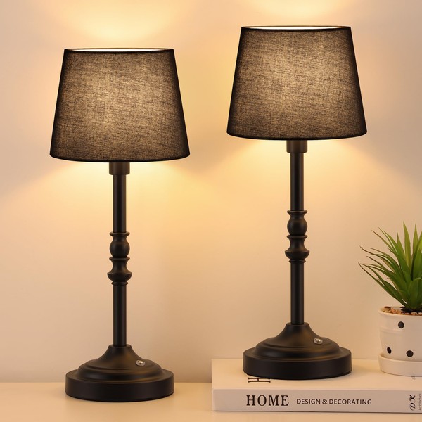GGOYING Set of 2 Rechargeable Cordless LED Table Lamps, 4-Level Dimmer, Black Portable Desk Lamps with Black Fabric Shades, Night Light for Dining, Bedroom and Patio