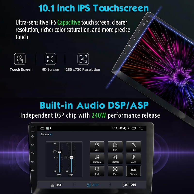 - DSP Sound Effects: The built- in Digital Signal Processor enhances in-car audio with real-time, high-precision sound processing. It delivers studio-quality tuning, adaptive EQ, immersive 3D effects. It offers customizable presets and efficient, low-latency performance, transforming your car into a premium listening space. The enhanced Bluetooth chip ensures a stable and smooth connection with your phone, providing high-fidelity sound quality for hands-free calls and Bluetooth music.