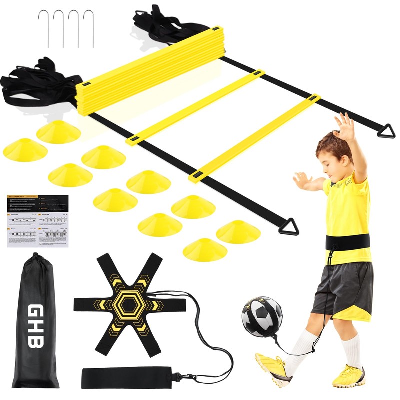 - Comprehensive Football Training Equipment: The kit includes a 12 rung 20 Feet agility ladder, 10 soccer cones, 1 Football Kick Trainer, 4 steel stakes for added stability, and a carrying bag