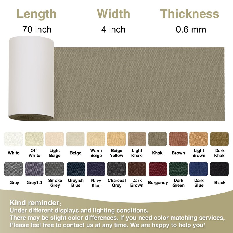 - Waterproof Cotton Canvas:Self-adhesive canvas outdoor repair tape is made of selected waterproof cotton canvas, strong texture, wear-resistant and scratch-resistant.0.6mm thickness is moderate, flexible, and can be tightly adhered to sofas, tents, and other indoor and outdoor items