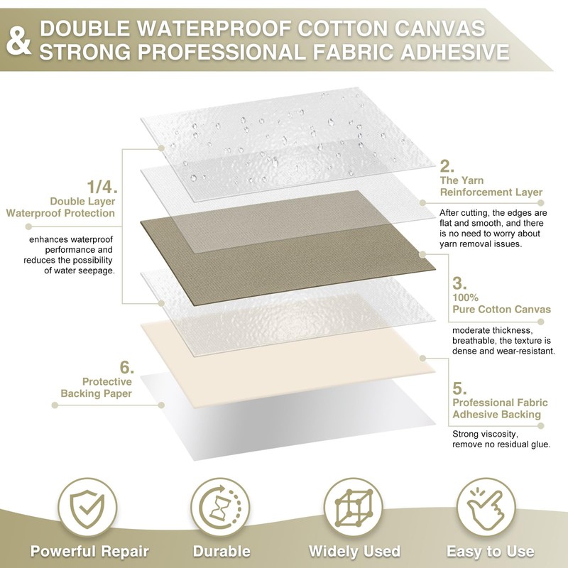 - Double Waterproof Coating & Anti-Yarn Separation Technology:The canvas fabric layer is impregnated with waterproof coating,the double waterproof layer excellently and effectively prevents rainwater penetration,making it suitable for outdoor use.The repair patch adopts anti-yarn separation technology,which makes the yarn of the patch more firm and tight,the edge is smooth and neat after cutting, the yarn is not easy to loose and separate,which is more durable than other similar products