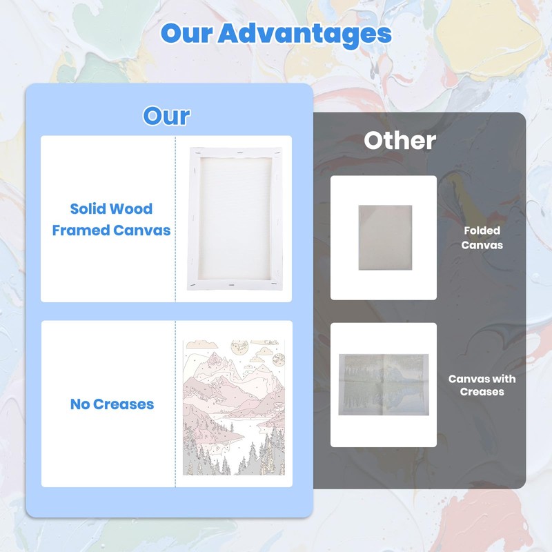 - FRAMED WRINKLE RESISTANT CANVAS Unlike other folded or rolled canvases, the framed digital oil painting kits we offer have no wrinkles and do not need ironing, and can be hung directly on the wall as a decorative painting after completion. We provide highlighted non-toxic acrylic paint, professional linen canvas with even texture and improved brushes.
