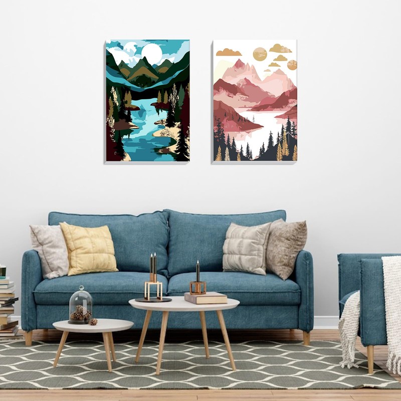 GHHKUD Paint by Numbers Adults, 2 Pieces Sunset Mountain Painting by Numbers with Frame, DIY Hand Painted Oil Painting Kit for Beginners with Wooden Easel and Acrylic Paint, Paint by Numbers 20 x 30