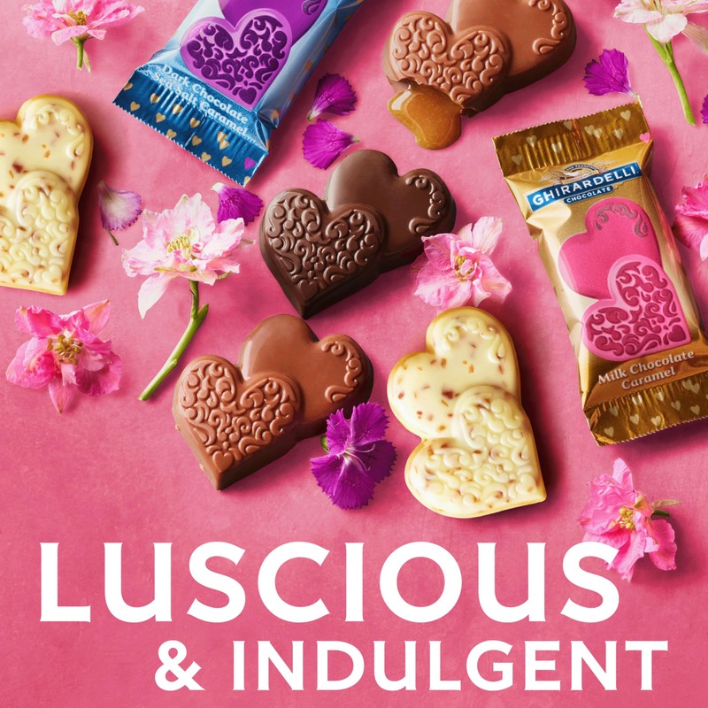 - Chocolate assortment with Crème Brulee White Chocolate Hearts, Caramel Milk Chocolate Hearts, Sea Salt Caramel Dark Chocolate Hearts, and Milk Chocolate Hearts