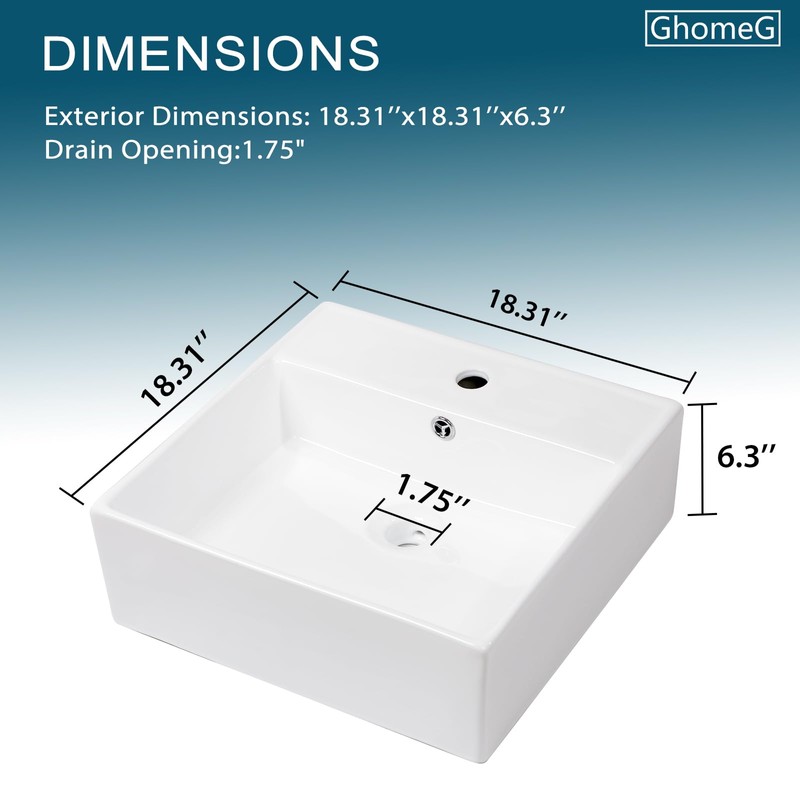 - Exterior dimensions : 18.3"x18.3"x6.3", our wall mount white bathroom sink has US standard 1.75”drain opening and overflow hole, please notice that: faucet and sink drains are not included in the package.