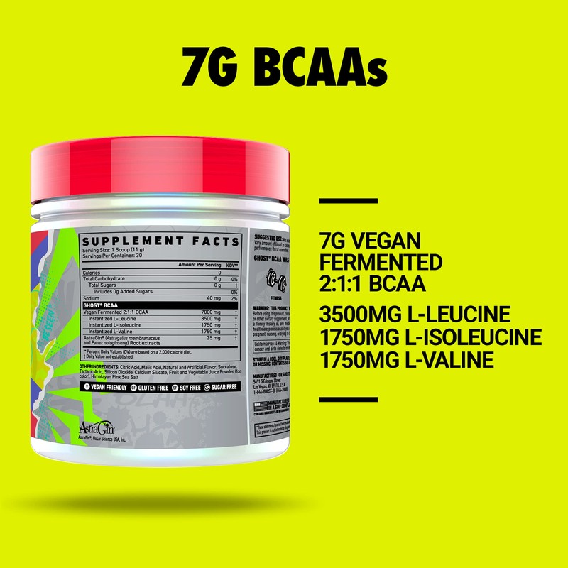- 7G BCAAs: GHOST BCAA delivers a massive 7G of vegan-fermented BCAAs (3500MG Leucine, 1750MG Isoleucine and 1750MG Valine) per scoop.