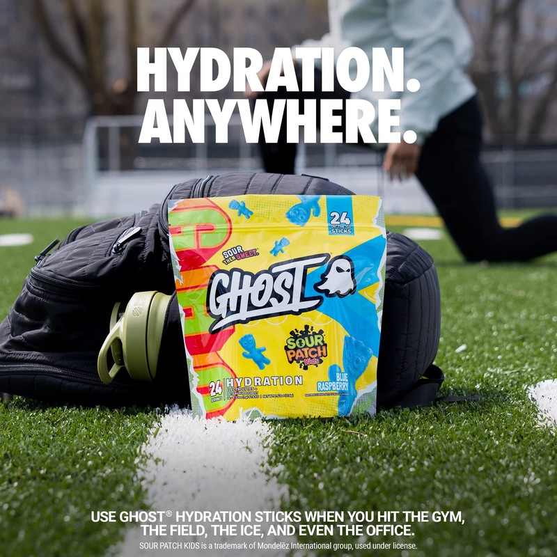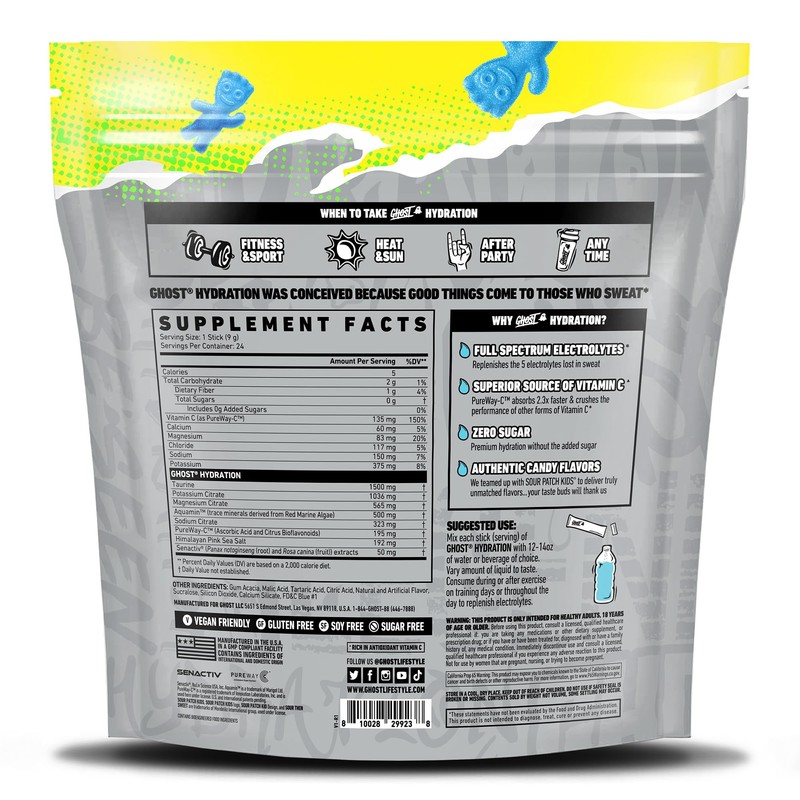 - Stay Hydrated: GHOST Hydration can be used anytime to elevate your water or replace sugary sports drinks. Grab a bottle of water (or your favorite GHOST shaker), toss in a stick of GHOST Hydration, and enjoy some seriously epic-tasting, electrolyte-enhanced H2O while you hit the gym, the field, the ice, or even the office on a Monday. Sour Patch Kids Blue Raspberry flavor. 1 stick per serving, 24 servings per container.