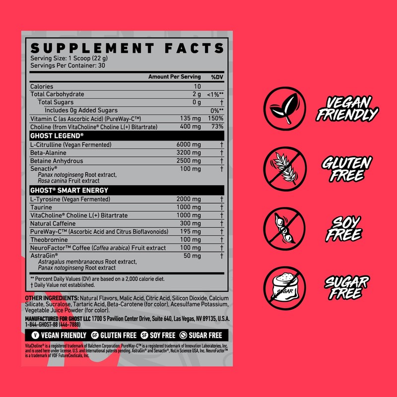 - Total Transparency: All GHOST products feature a transparent label that fully discloses the dose of each active ingredient. Zero proprietary blends means you know what you're getting in each and every scoop. GHOST Legend is vegan friendly, gluten free, soy free, and sugar free.