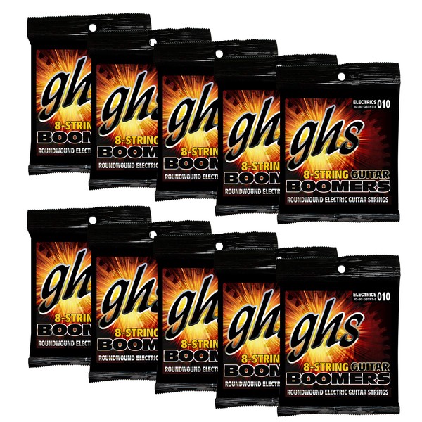 GHS Strings GBTNT-8-10 Pack - Guitar Boomers 8-String Set, Nickel-Plated Electric Guitar Strings, Thin-Thick (10-80), Pack of 10