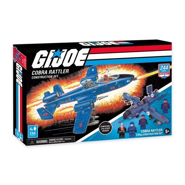 - 244 PIECE CONSTRUCTION SET: This GI Joe Construction Toy Playset includes the menacing Cobra Rattler Fighter Jet. Also includes 4 GI Joe Mini Figures: Cobra Commander, Destro and 2 Cobra Soldiers.