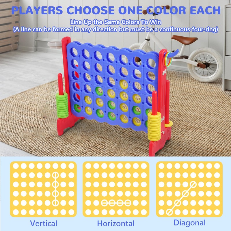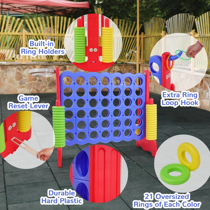 Elevon Giant 4-to-Score Game Set, 4-in-A-Row Jumbo w/Basketball Hoop, Ring Toss, 42 Jumbo Rings & Quick-Release Slide, 2.75FT Tall Indoor Outdoor Yard Family Connect Game for Kids & Adults